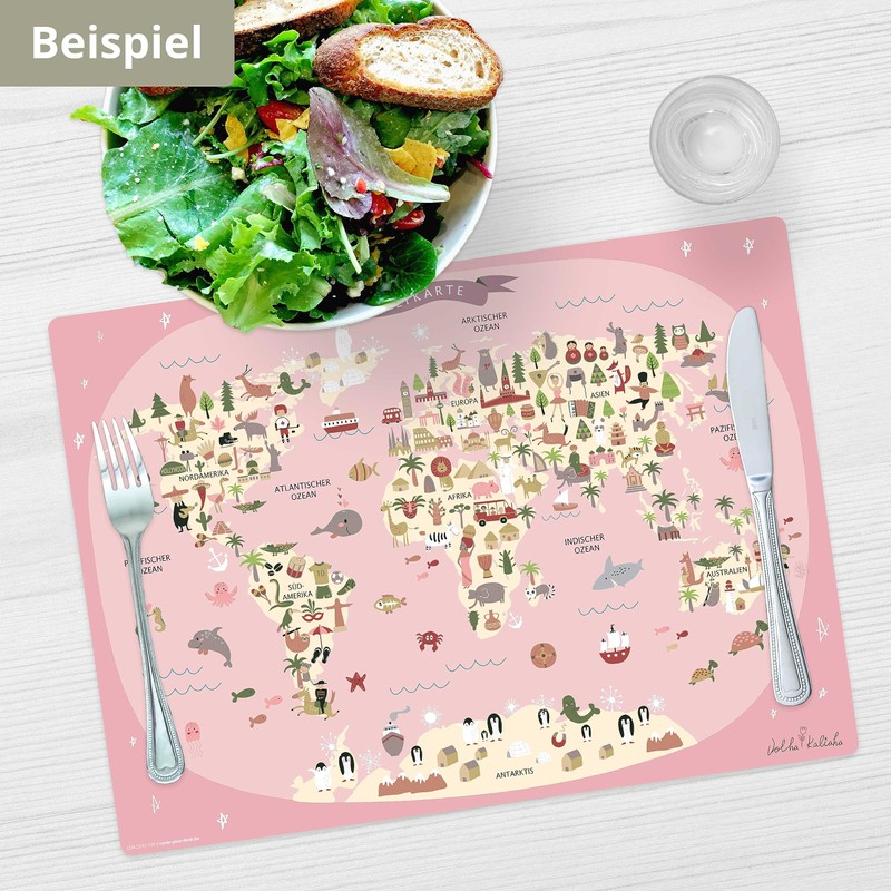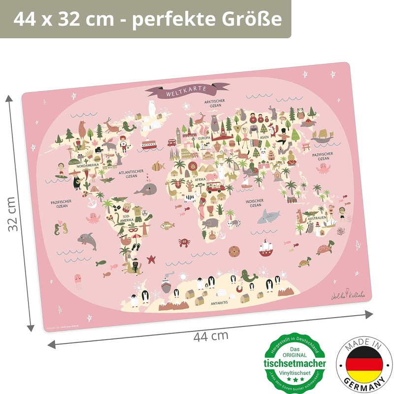 Tischset | Platzset abwaschbar – Weltkarte in rosa mit Tieren in deutsch – 44 x 32 cm – aus hochwertigem Vinyl