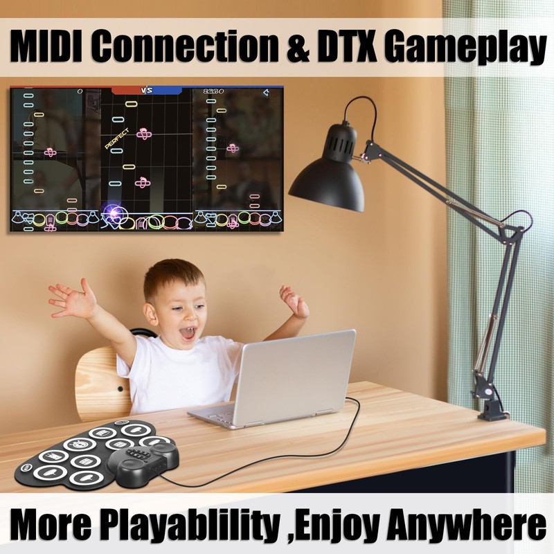 - 🎮【MIDI Connect & Gameplay】It is easy to connect the electric drum to computers to produce music or play DTX games, or connect external speakers for family entertainment/birthday parties. Perfect for adults who need MIDI functionality and children for entertainment.