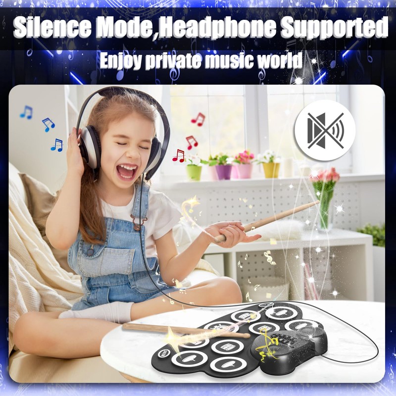 - 🚋【Drumming On The Way】The electronic drum pad is made of high-quality soft silicone, which can reduce the noise when drumming. Enjoy your own music world with 3.5mm jack headphone . If you wanna take it outdoors ?jut roll it up, and pack it in your bag.