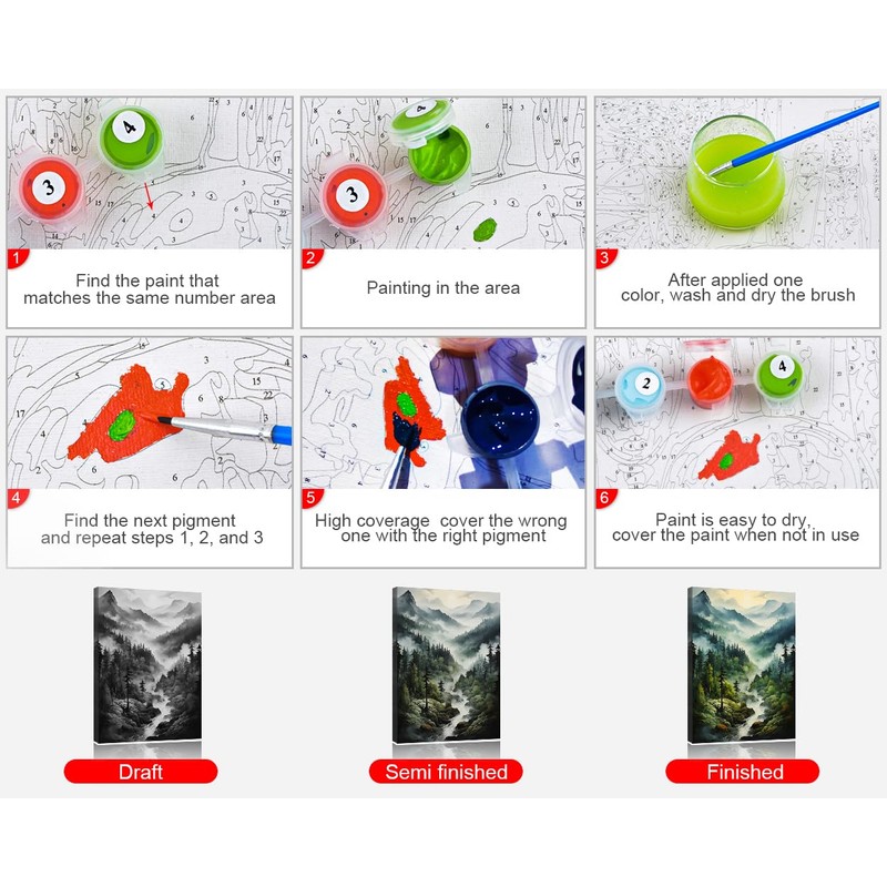 - Easy To Be A Painter: Paintings are simple and easy to draw, not complicated, and can be easily handled by teenager, adults, and the elderly. Two easy steps to complete a painting, first: dip the paint. Second: paint the corresponding numbers on the canvas.