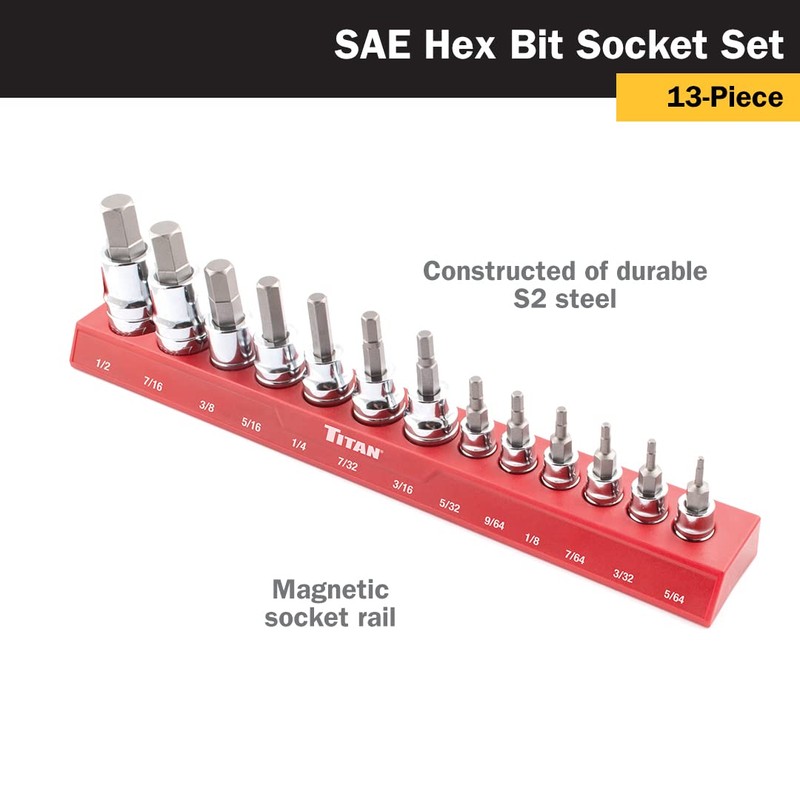 Titan 85530 13-Piece SAE Hex Bit Socket Set, Magnetic Socket Organizer with Laser-Etched Size Markings,Black