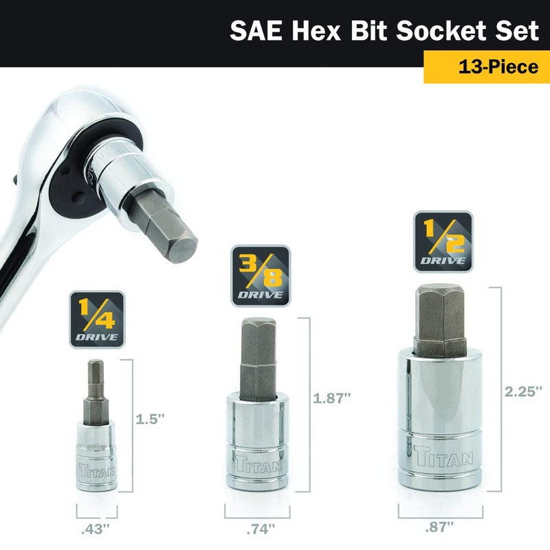 - Set includes: (6) 1/4-Inch drive: 5/64, 3/32, 7/64, 1/8, 9/64 and 5/32-Inch, (5) 3/8-Inch drive: 3/16, 7/32, 1/4, 5/16 and 3/8-Inch, and (2) 1/2-Inch drive: 7/16 and 1/2-Inch SAE hex bit sockets