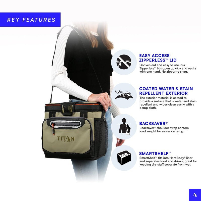 The Arctic Zone Titan Deep Freeze Zipperless Hardbody Cooler features Deep Freeze Insulation, Hardbody Liner, and SmartShelf and is perfect for storing ice for up to two days while keeping your favorite foods and beverages cold. Able to hold up to 16 cans, this cooler uses Deep Freeze High-Performance Insulation with a radiant heat barrier and a Zipperless lid for quick access to food and drinks. The removable Hardbody liner with SmartShelf allows you to separate soft and hard items so that soft items don't get crushed. If you need more space, the SmartShelf easily removes to provide one large compartment. Our Cooler features an adjustable Backsaver Shoulder Strap with a shoulder pad for comfort as well as tough, water-, and stain-resistant Rhino-Tech exterior material that is easy to clean. Designed for convenience and usability, the Arctic Zone Titan Deep Freeze Zipperless Hardbody Cooler is perfect for keeping food and drinks cold no matter where you go!