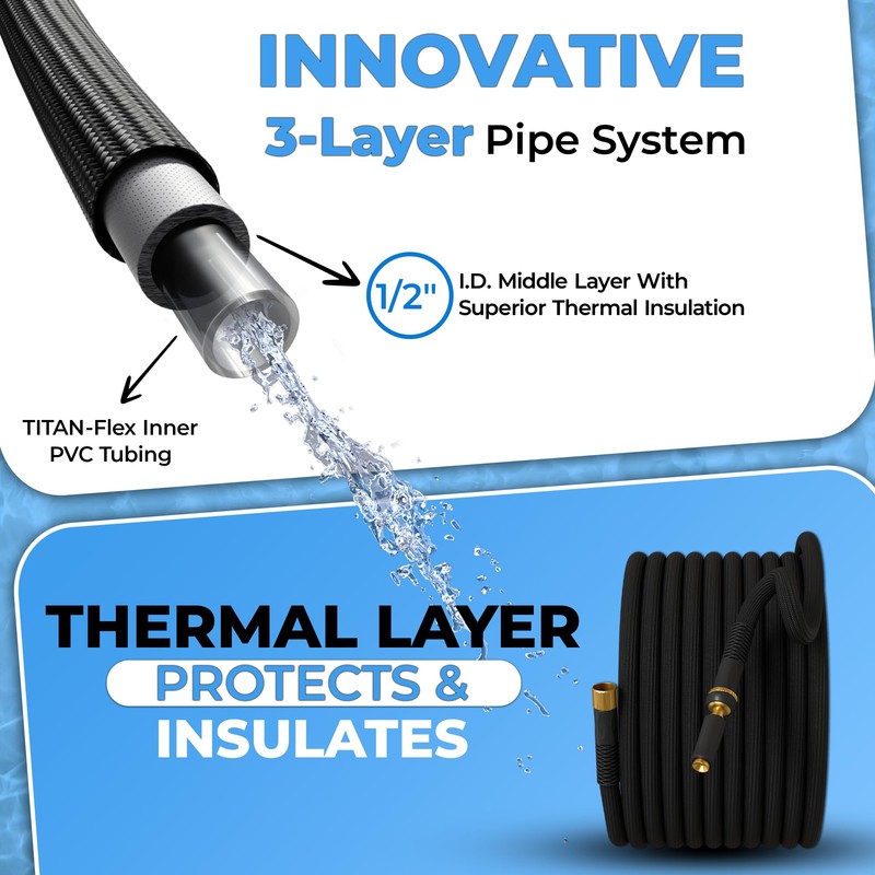 - TITAN GARDEN HOSE: Unmatched flexibility, durability, and flow. Its lightweight, full-length, Patent-Pending multi-layer design provides reliable, leak-free performance for long-lasting utility. [This hose does NOT expand or retract]