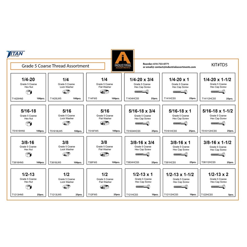 Titan Industrial Supply- 1275 Piece Grade 5 Coarse Thread Fastener Assortment- Hex Cap Screws, Hex Nuts, Flat Washers & Lock Washers-Fasteners Only