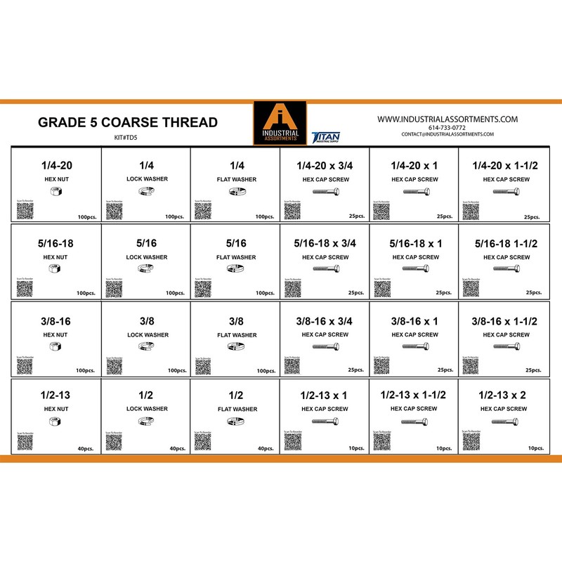 Titan Industrial Supply-1275 Piece Grade 5 Coarse Thread Metal Drawer Assortment