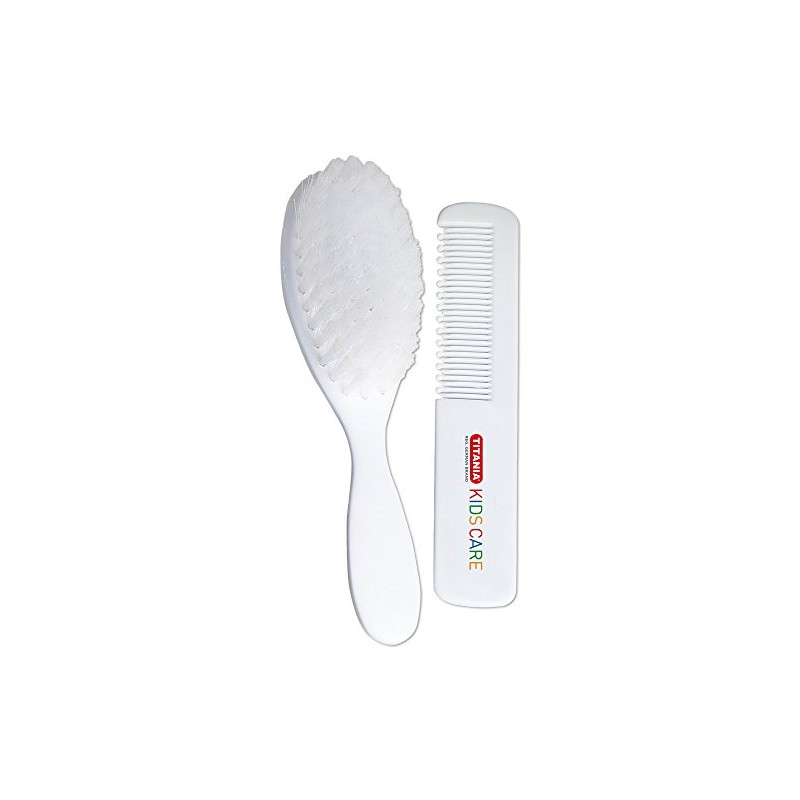 Baby brush and comb set With the soft brush, the sensitive baby scalp is delicately treated and massaged. - Hair brush and comb for babies - With Teddy bear print on the brush - Comb with rounded comb spikes - Choice of three colours: light blue, pink or white. The comb included in the set has rounded prongs to ensure safe use when combing the hair. Baby brush and comb are available in three colours: light blue, pink or white. Length: brush approx. 15 cm, comb 13, 5 cm. Material: plastic. Manufacturer: Titania.