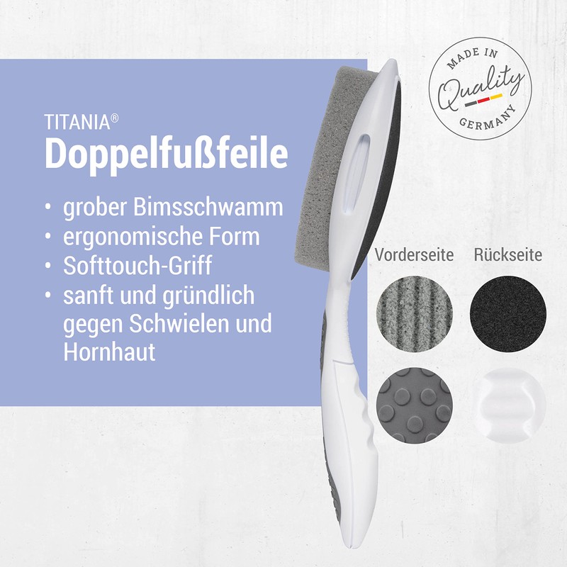 - 2-in-1 foot file + pumice sponge: this TITANIA double foot file impresses with a practical combination of emery surface and pumice sponge. The combination of the fine emery surface and the coarser pumice sponge grating surface ensures particularly soft and gentle feet after application. With the two rubbing surfaces in coarse and fine, the foot file ensures skin-friendly foot care by gently and thoroughly removing calluses and calluses.