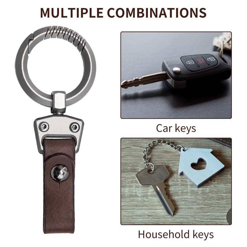 - ✅VERSATILE KEYCHAIN The product is small, lightweight, easy to carry and does not feel heavy. Leather keyrings are perfect for all types of keys. Decorate them on car keys, office keys, house keys and bags. The titanium clip and leather can be individually combined into other key rings or rings, ideal for car and home, handbag, wallet, bags, belts etc.
