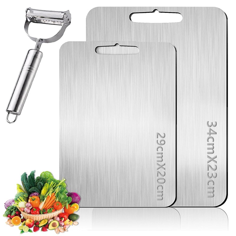- Quality materials: Our titanium cutting board is made of durable 304 stainless steel titanium alloy, which is not easy to corrode and rust, reusable and durable. The size is 29 x 20 cm and 34 x 23 cm