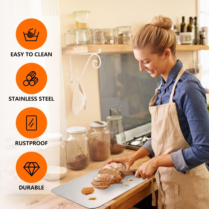 - Easy to clean:Stainless Steel Cutting Board Unlike traditional chopping boards, there will be no food residue;The unique material makes it very easy to clean,Just rinse with clean water and no food odor will remain for a long time.
