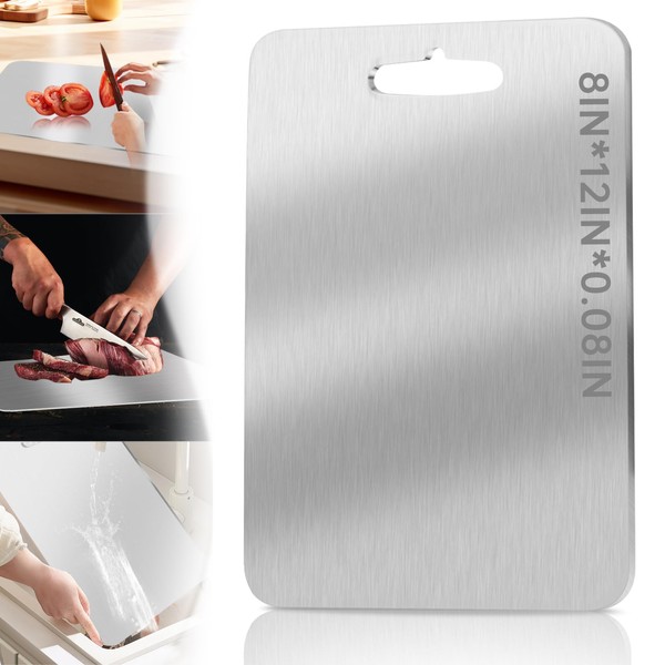 - STURDY & DURABLE DESIGN: Our titanium cutting boards are constructed from 0.08in titanium metal, highly resistant to cuts, grooves, and punctures. They won't warp or bend, ensuring a smooth, hygienic surface that is safe for food preparation. Say goodbye to cracking and splintering