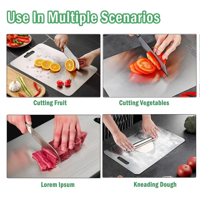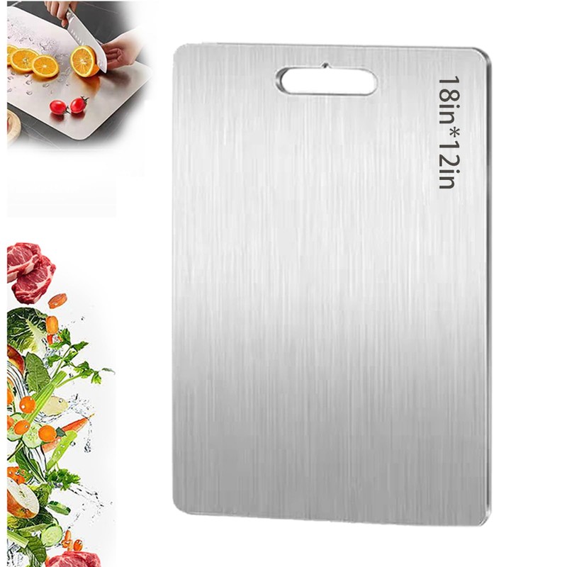 - Easy to Clean: Cooking is effortless and worry-free with this stainless steel cutting board. Its surface is easy to clean; simply wipe it clean with water. The wide, ergonomic handles provide easy grip, stability, and storage. Whether you hang it to dry or carry it with you, this titanium cutting board combines convenience with practical kitchen functionality.