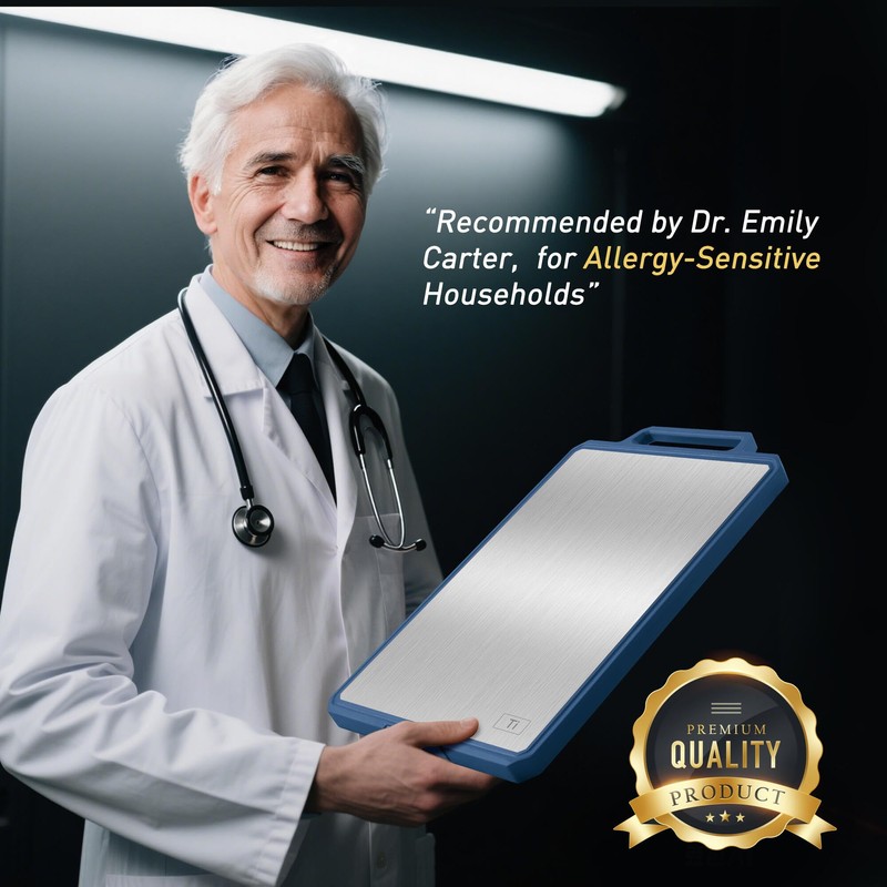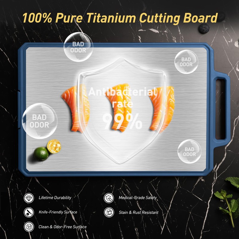 • High-Quality & Food-Safe Materials: Our cutting board excels with premium materials. The titanium side, made from medical-grade titanium, solves traditional board flaws—no cutting gaps, trapped residues, or odor absorption, ensuring hygienic cooking. This other side is BPA-free, making it safe for direct food contact. Perfect for slicing meats or chopping vegetables, its sturdy construction resists wear and tear, providing a reliable, long-lasting solution for all your kitchen tasks.