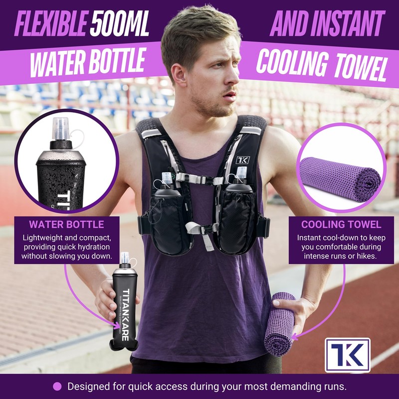 - LIGHTWEIGHT AND BREATHABLE DESIGN: The TITANKARE running vest lightweight backpack, designed in the UK, is made from ultra-light, durable fabric with breathable mesh to keep you cool and dry during marathons, trail running, cycling, hiking, and more. Comes with a cooling towel to help you stay refreshed during your adventures