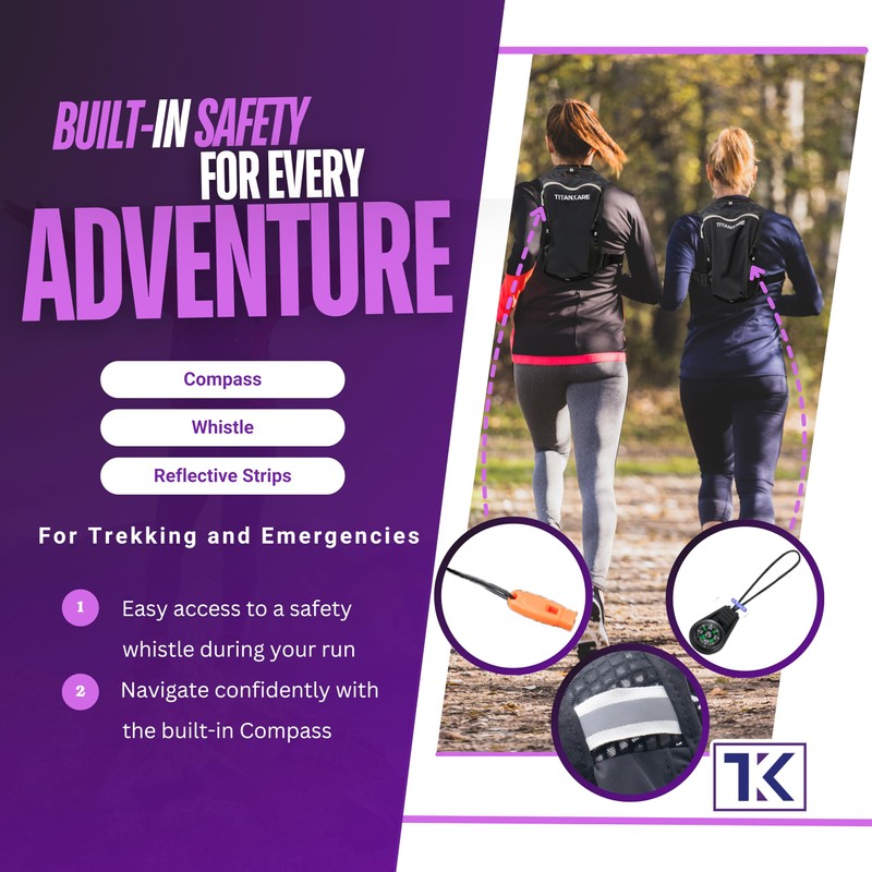 TITANKARE Running Vest Elite – Elevate your outdoor performance with the TITANKARE Running Vest Elite, designed for serious runners and adventurers. This lightweight, breathable running vest is crafted from 100% nylon stretch mesh, weighing just 250g. With a generous 5L capacity and adjustable chest size (89cm–109cm), it fits comfortably for all body types. Equipped with reflective strips for night visibility, a whistle, and a compass for safety, this vest is ideal for marathons, trail running, and cycling. The package includes a 500ml TITANKARE soft bottle for hydration and a cooling towel to keep you refreshed. Perfect for marathon runners, hikers, and outdoor enthusiasts looking for a reliable and functional running vest!