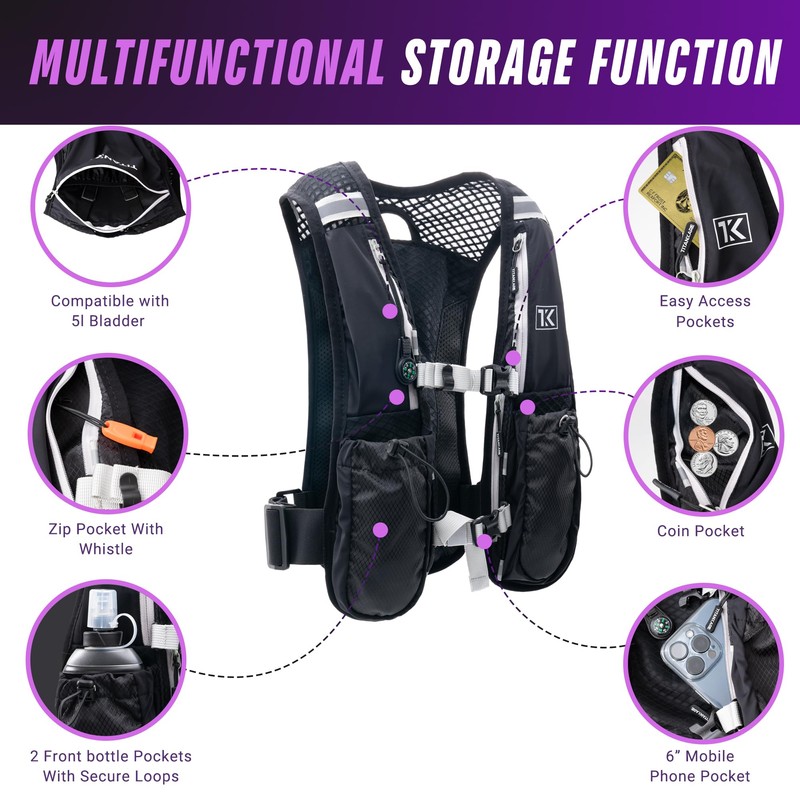 - MULTIPLE EASY ACCESS POCKETS: Designed with easy-access pockets, this running vest backpack provides ample space to store essentials like water bottles, phones, keys, and nutrition gels, making it perfect for all your outdoor activities.