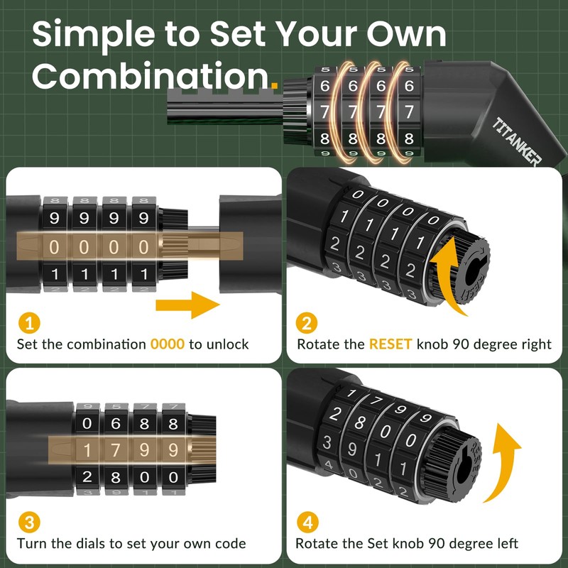 - Easy to Set Combination: Our Titanker combination bike lock cable features 4-digit combination locking mechanisms for keyless convenience. Attached with a free bike lock mounting bracket for easy carrying, one stop handy solution.
