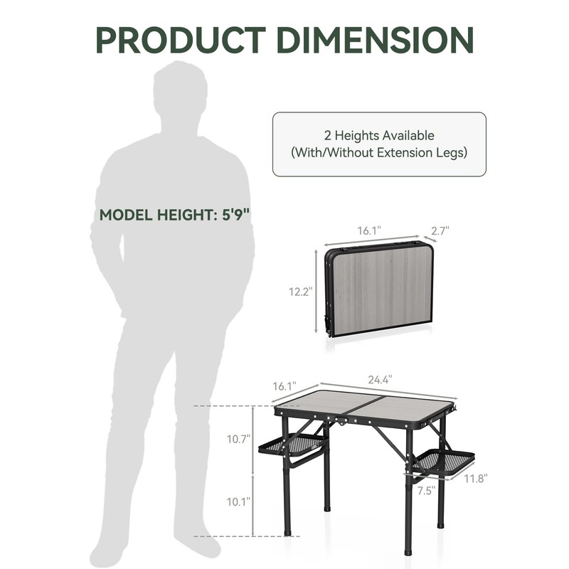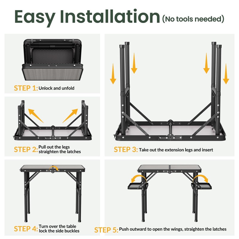 - Simple 5-step Installation (No tools needed). Step 1: Unlock and unfold. Step 2: Pull out the legs and straighten the latches. Step 3: Take out the extension legs and insert. Step 4: Turn over the table and lock the side buckles. Step 5: Push outward to open the wings, straighten the latches. Done. Please refer to the installation steps in the picture.