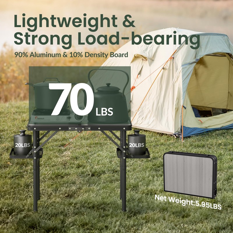 - Lightweight & Strong Load-bearing. Our folding camping table is made of 90% aluminum & 10% density board, ensuring that it is light and strong at the same time. The picnic table is 6 lbs heavy and supports up to 70 lbs, and each wing supports up to 20 lbs.
