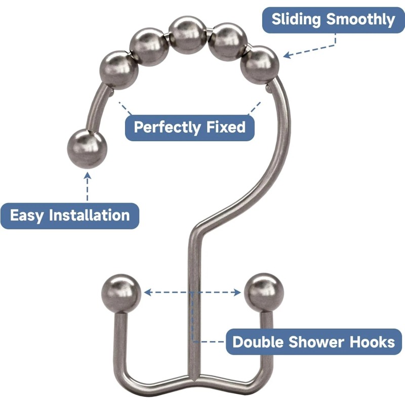 - Double hooks design - The double roller glide shower hooks are strong enough to hold up shower curtain and shower liner.
