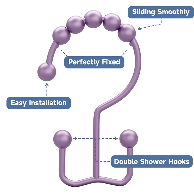 • Double hooks design - The double roller glide shower hooks are strong enough to hold up shower curtain and shower liner.