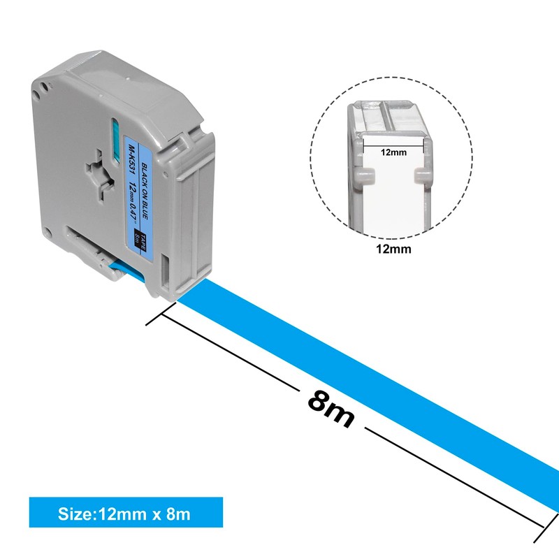 - Package: 6 pack compatible for brother label printer tape m-k231 m-k131 m-k431 m-k531 m-k631 m-k731. Color: Black on White/Clear/Blue/Red/Yellow/Green, Width: 12mm (1/2 inch), Length: 8m (26.2 feet)