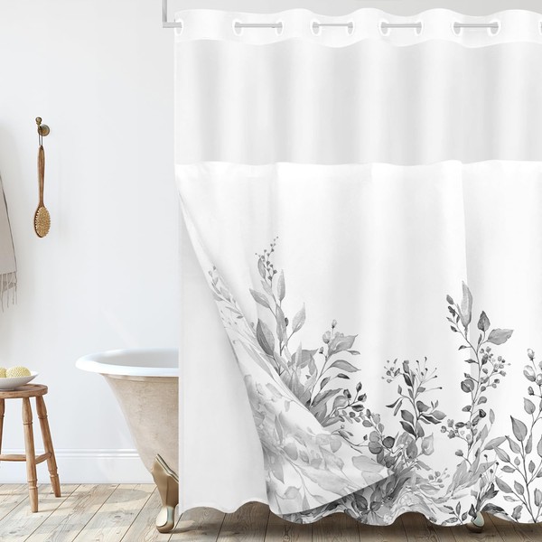 Tititex No Hooks Snap in Liner Grey Eucalyptus Leaves Shower Curtain Sets, Hotel Luxury Double Layers Waterproof Fabric & See-Through Top Window Bathroom Decorative 72x72 Inch