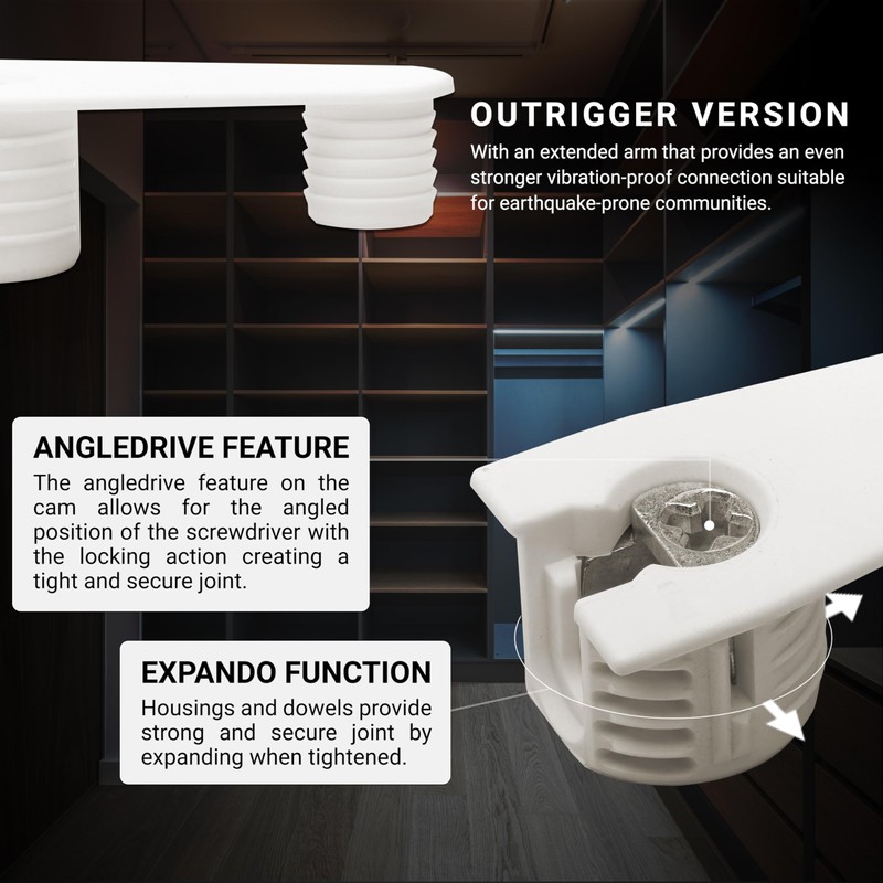 - ANGLE DRIVE: This is a feature on the furniture fastener cam lock that allows for the angled position of the screwdriver with the locking action creating a tight and secure joint.
