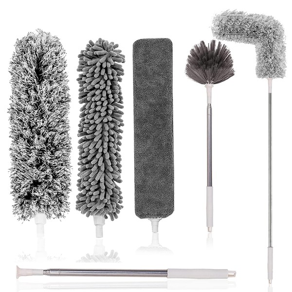 - 【Upgraded Durable 5 PCS Feather Duster Kit】: The dusting wand includes a bendable microfiber duster head, a chenille duster head, a crevice brush, a cobweb duster, and a telescopic pole. Perfect for furniture, corners of high ceilings, ceiling fans, blinds, windows, cobwebs, cars, bookshelves, sofa and etc. With its lightweight feature, easy for both adults and children to use.