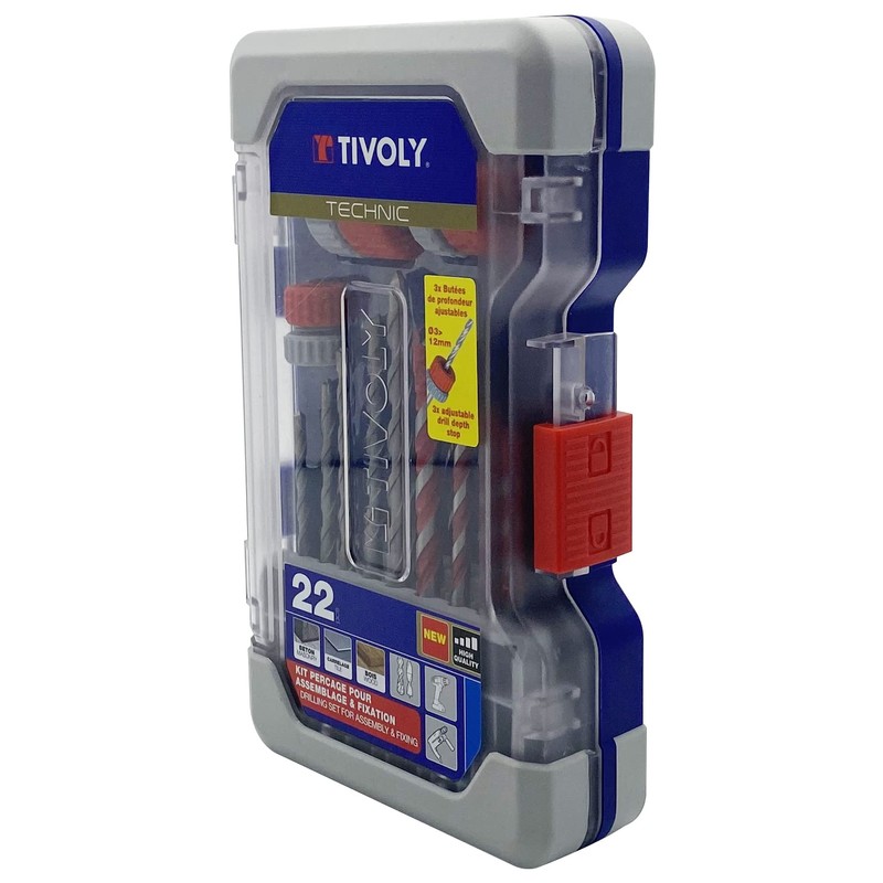 Tivoly 11901170061 Storage Box 22 Pieces, Tile, Concrete, Wood and 3 Depth Stops for Drill Bits Diameter 3 to 12 mm, Red Grey