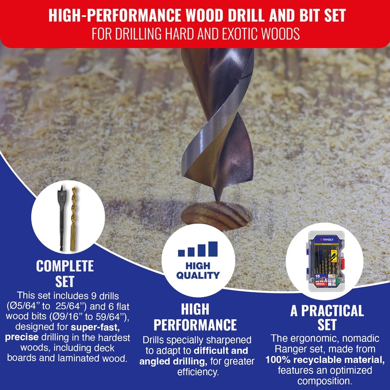 TIVOLY - Drills + Wood Bit Set - for Hardwood Drilling - 15 Piece Kit : 9 HSS SpeedPoint Wood Drills Ø 5/64" to 25/64" + 6 Flat Wood Bits Ø 9/16" to 15/15"