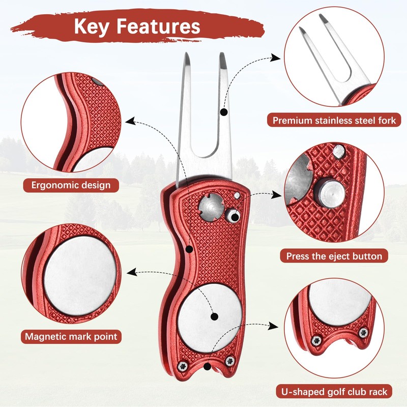TIXIPEM Golf Divot Repair Tool [4PCS] - Switch Foldable Divot Tool Rack with Magnetic Ball Marker & Open Button Use for Golf Accessories & Gifts - [Red] Green Fork Tines