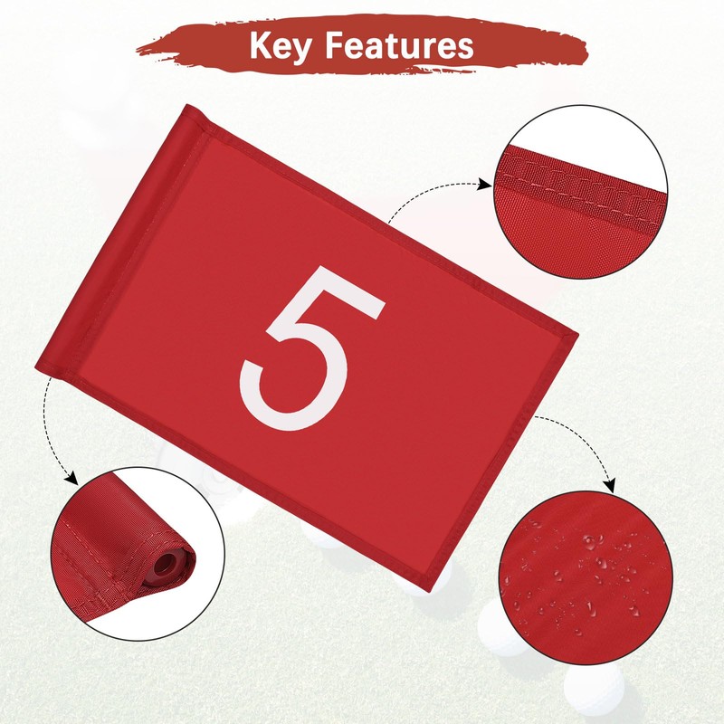 - EASY OPERATION: The left side is equipped with a pre-sewn ABS tube. A flagpole with a diameter of 3/8"< D <6/8" is installed. The golf flag is fixed on the flagpole and finally inserted into the putting cup and the ground