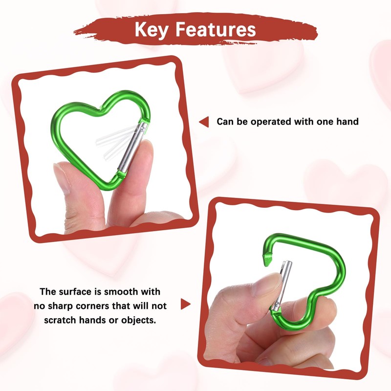 1. Features&Applications: Heart-shaped design. It is a good choice for securing keys, attaching gear to backpacks, organizing pet leashes, and outdoor activities like hiking/camping.