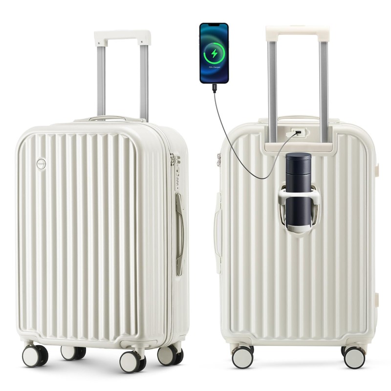 TIYFIY 24in Hardside Luggage with Spinner Wheels and Built-in TSA Lock Durable Suitcase Rolling Luggage with USB Port Cup Holder (White)