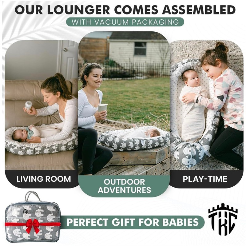 TKC Baby Lounger 0-24 Months | Adjustable Infant Lounger | Breathable Organic Cotton Cover | Reversible, Portable Baby Nest | Includes Bib | Elephant