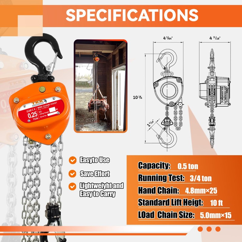 - 👍[EFFICIENT 1/4 TON HOIST] – Upgrade your workload with this robust manual chain hoist, lifting loads up to 550lbs effortlessly with a 10-foot chain and durable 5mm Load Chain Diameter.