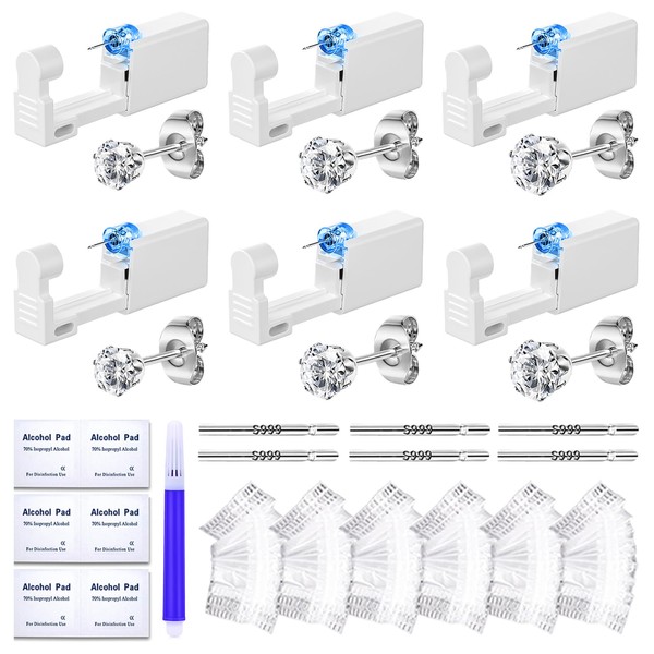 - PACKAGE INCLUDES: You will receive a 31 pcs professional piercing kit, including 6 pcs disposable ear piercing guns, 6 pcs premium cubic zirconia earrings studs (3/4/5mm), 6 pcs S999 silver ear sticks, 6 pcs waterproof ear covers, 6 pcs cleaning pads, 1 pcs marker pen. Providing you with everything you need for a perfect piercing every time, whether you're a beginner or a professional