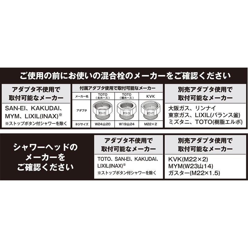- Compatible manufacturers: TKS, TOTOTO, LIXIIL/INAX, SAN-EI, Takagi, GROHE, KAKUDAI *LIXIL (INAX) excludes shower with stop button. Manufacturers that can be installed with included adapters: MYM, KVK, Gaster TOTO (Thick Hose), W24 M20, TOTO (Thin Hose) [W19-24], K. VK (M2). 2 x 2: *TOTO resin elbow (the part that connects the faucet and shower hose is not metal, but resin type). Depending on the manufacturer of the showerhead, an adapter (sold separately) may be required when connected