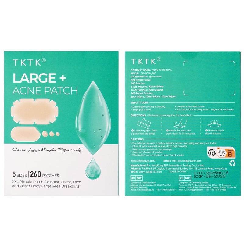 - Largest Body Acne Patch: TKTK zit patches contains 5 pcs 95x 52mm XXL patches, which are about three times the size of the regular large size. It can cover larger acne areas such as the back, chest, and shoulders at one time without using multiple dot patches