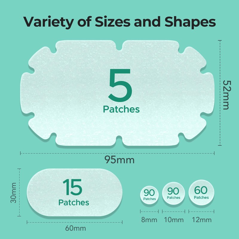 - 260 Patches with Variety of Sizes: Great amount with 5 sizes (8 mm, 10 mm, 12 mm, 95*52 mm, 60*30 mm) for your beautiful skin, no trouble even to cover a big pimple.