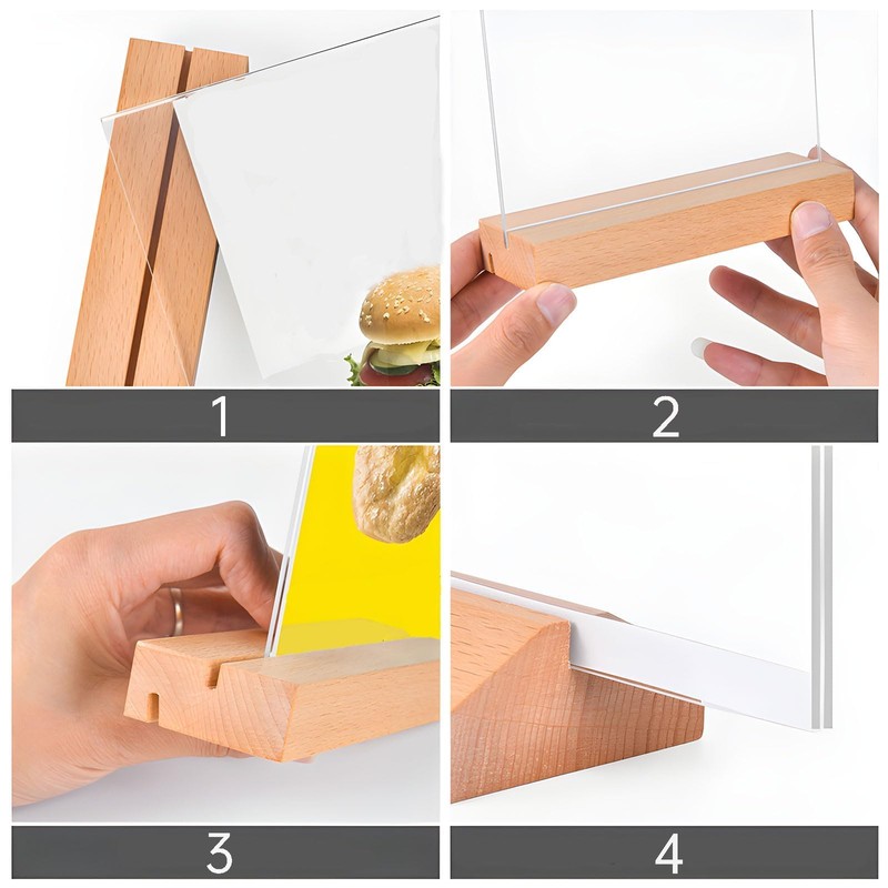 - Acrylic menu stands are easy to install. Simply place the paper between the acrylic plates and slide it into the wooden base.