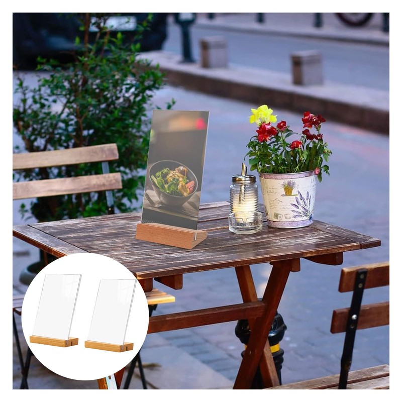 Tkxjry 2 Sets Wooden Restaurant Menu Stands, Acrylic Wooden Base Table Stand, Menu Card Holder, Plexiglass Advertising Stand, A4 Table Sign Holder for Office, School, Restaurant, Shop, Hotel