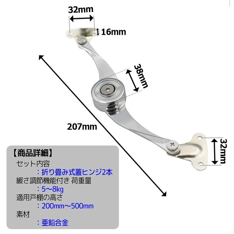 - [Product Details] Set Includes: 2 x Folding lid hinges, Adjustable looseness feature, Load weight: 11.0 - 17.6 lbs (5 - 8 kg), Applicable cabinet height: 7.9 - 19.7 inches (200 - 500 mm), Material: Zinc alloy