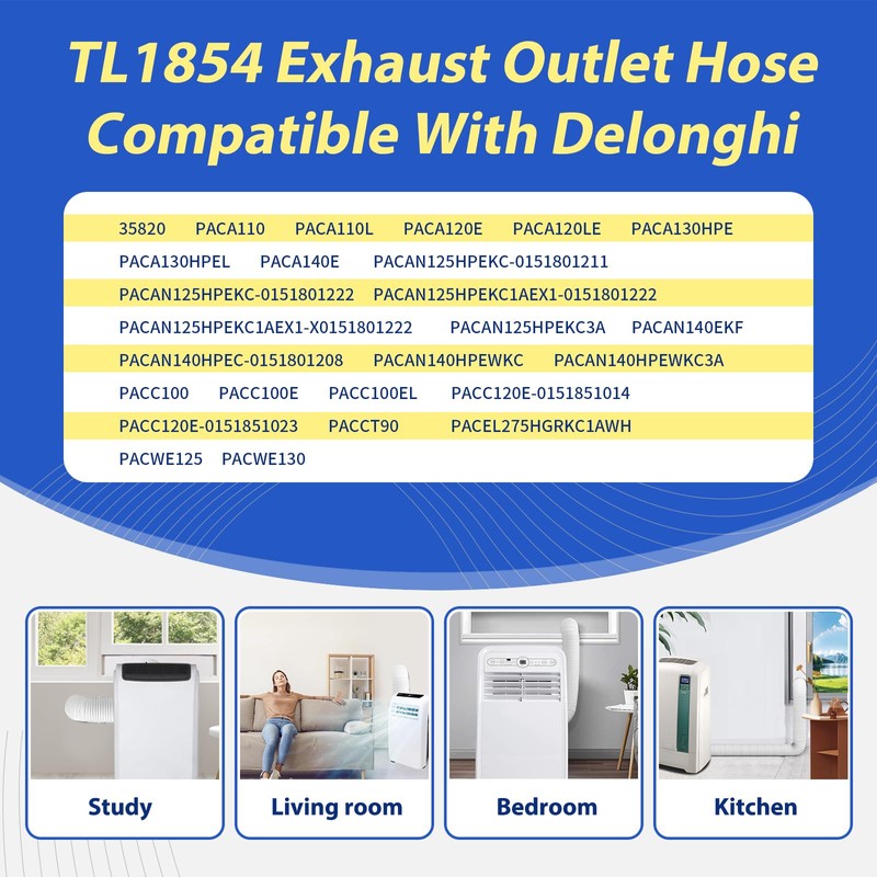 - 【Fits Model】TL1854 exhaust outlet hose tube compatible with De'Longhi PACA140E, PACC100EL, PACC100, PACA110, PACCT90, PACWE125, PACWE130, PACA110L, PACA120E, PACC120E, 35820, PACA130HPE, PACA130HPEL, PACA120LE, PACC100E, PACAN140HPEWKC3A, PACAN125HPEKC3A, PACAN125HPEKC1AEX1, PACAN140EKF, PACAN140HPEWKC, PACAN125HPEKC, PACAN140HPEC, PACEL275HGRKC1AWH