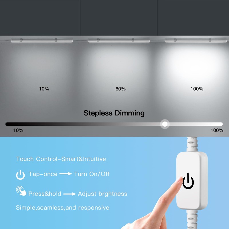 - Intelligent dimming system: Innovative touch control: single click switch/long press infinitely dimmable (10%-100%), automatically memorize the last brightness. Adopt sensitive capacitive touch technology, response speed <0.3 seconds