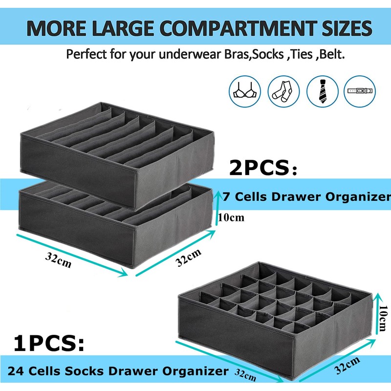 - 3 pieces drawer organiser set: the package contains a 3 pieces of large storage space that meets different organisation requirements. With 2 pieces 7 cell organizer boxes(for bra), 1 piece 24 cell organizer boxes(for socks)