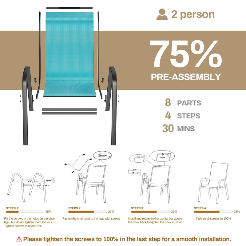 - INSTALLATION INSTRUCTION: Patio chair has detailed installation tutorial, requiring two people to work together. During installation, each screw should be tightened to 70%, rotate rod on the back of chair to adjust length to appropriate position to tighten chair fabric, finally tighten all screws to 100%