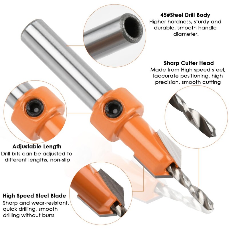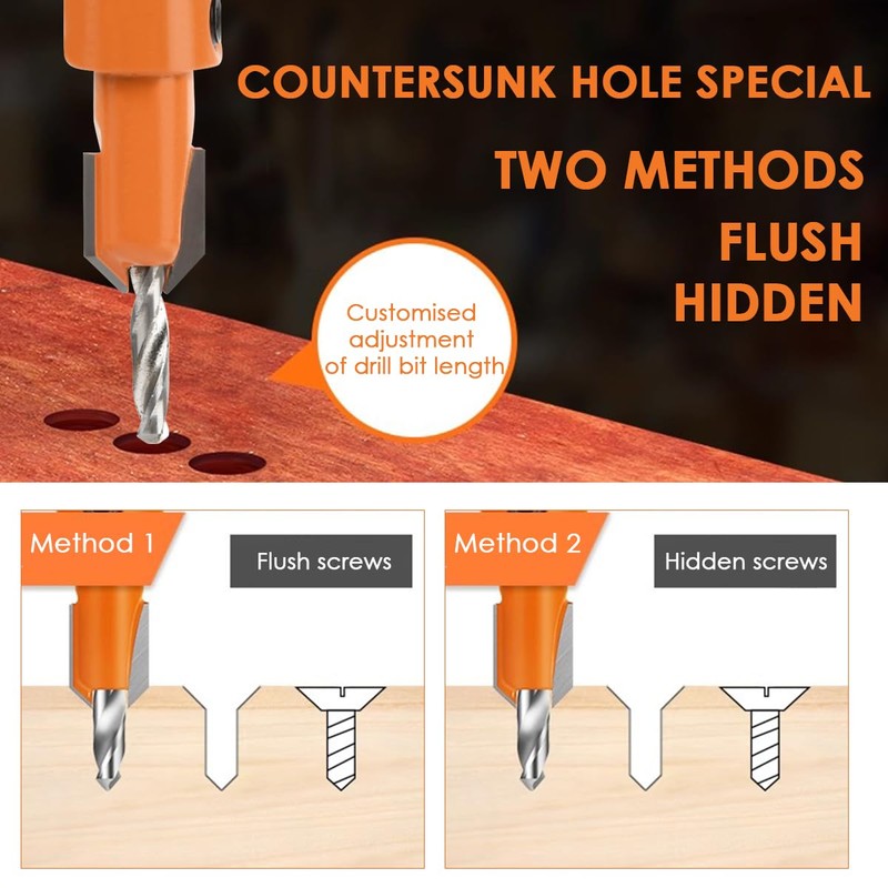 Countersink bit allows for adjustable drilling depth using the included wrench, making it compatible with screws of different lengths and improving both efficiency and precision.